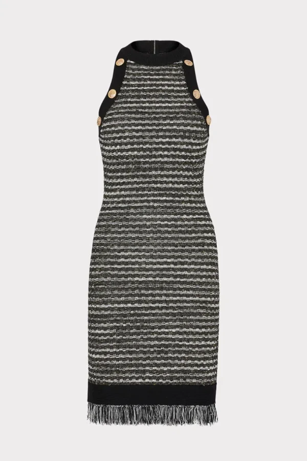 Fashion MILLY Halter Textured Fringe Knit Mini Dress Black Gold Multi