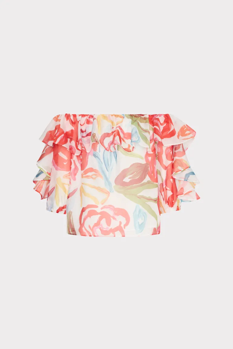 This off-the-shoulder silhouette is adorned with dramatic layers of organza ruffles across the neckline and sleeves. For night’s out, pair it with your favorite MILLY pants or skirts in a neutral hue.