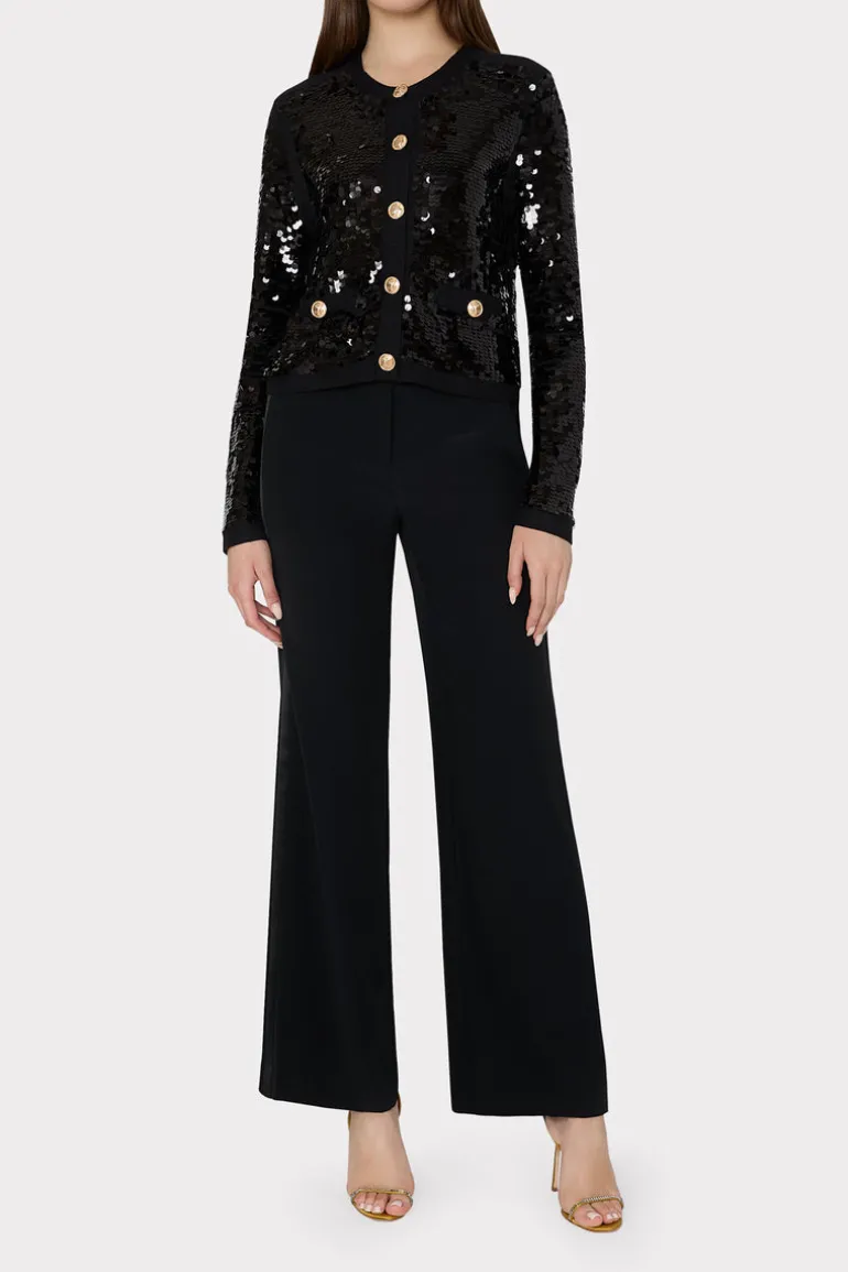 One of the most timeless of our signature MILLY styles is our classic cardigan sweater that we’re now offering in a sequined fabric for holiday. It has a front button closure and black trim. Wear it every day with black denim or on special occasions with its coordinating MILLY skirt.