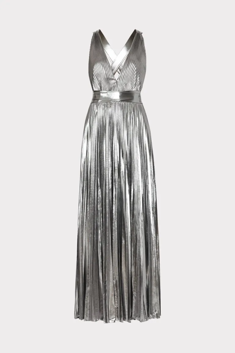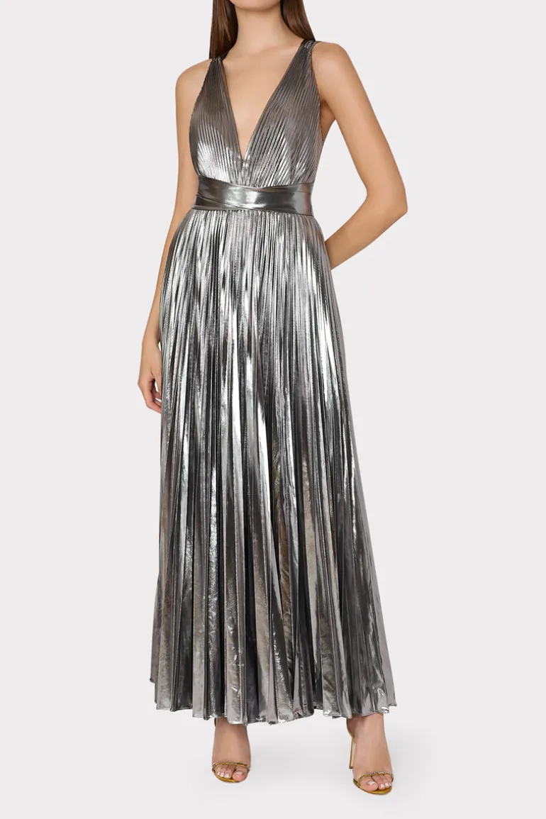 Pleated throughout, the Oria maxi dress features a skin-baring v-neckline, and an empire waistline with a sweeping skirt that falls to a maxi length. In the back, there’s elastic at the waistline as well as a criss-cross detail. This season, it’s offered in a festive metallic lamé.