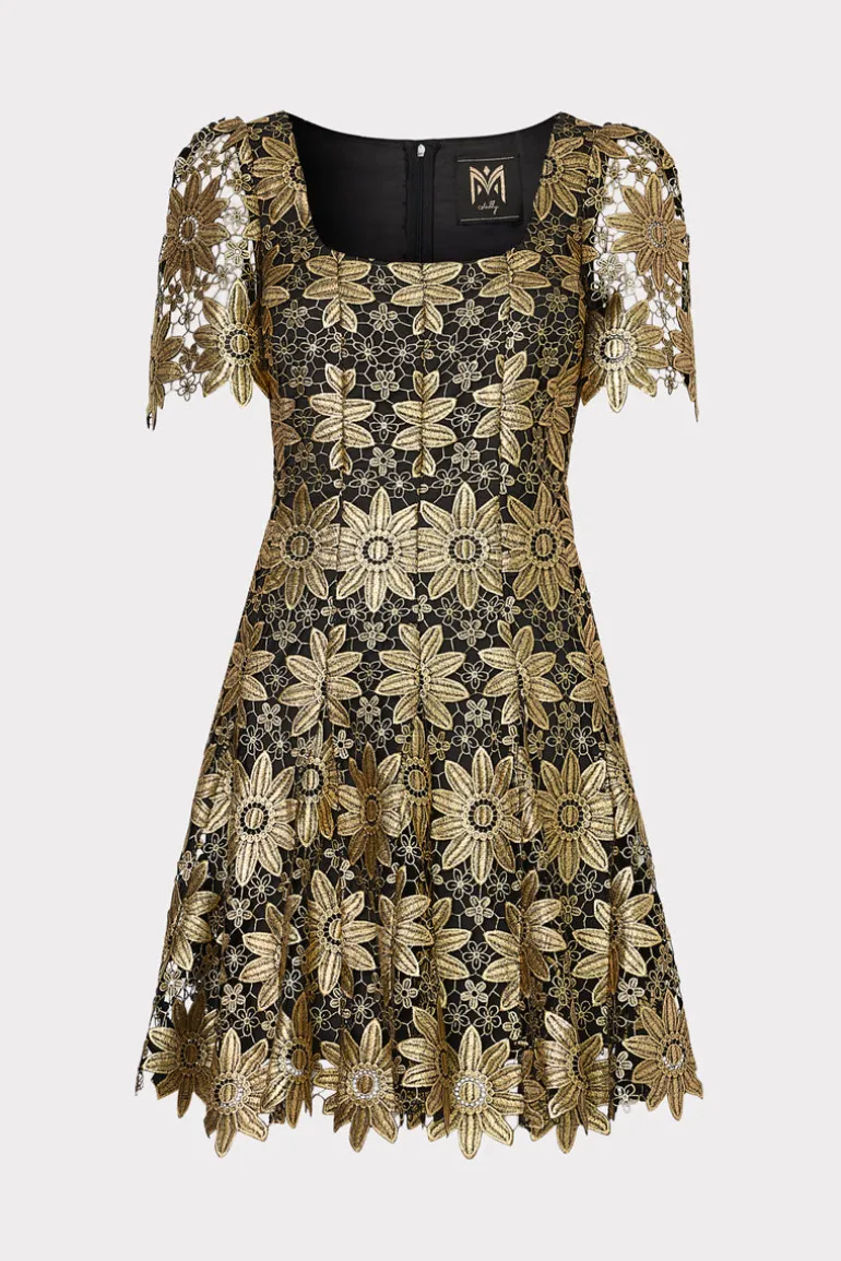 For your next exclusive party, bring the glamour with our Ilisa mini dress. This ankle length dress features an artisanal metallic gold lace godet pattern that serves as an overlay. It has a square neckline, sheer short sleeves and a raw-edged hem.
