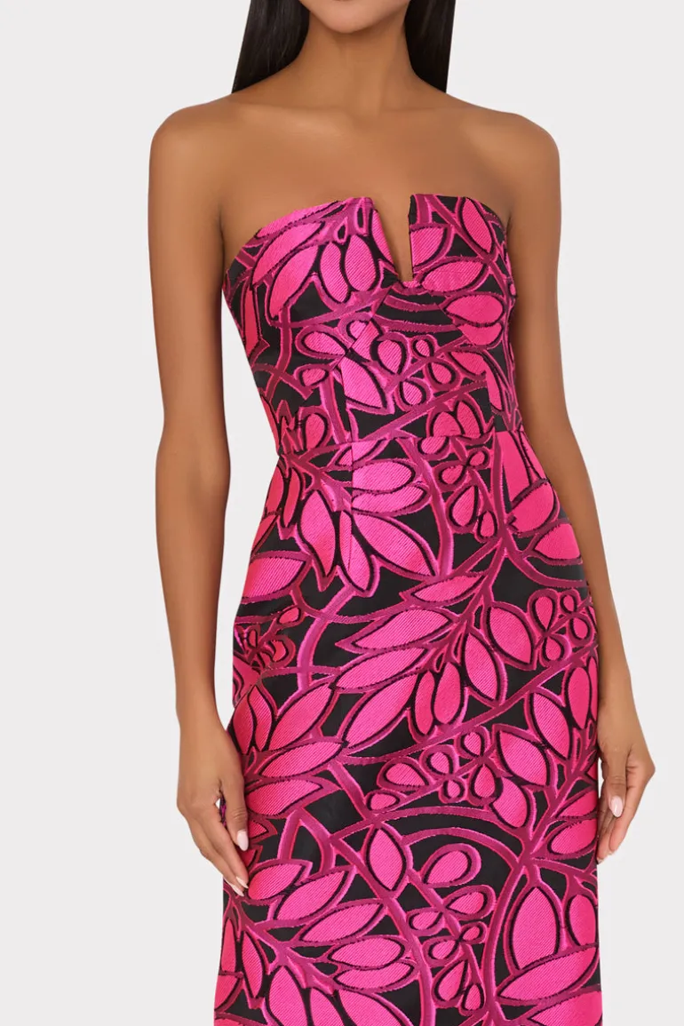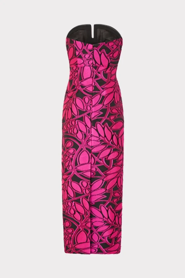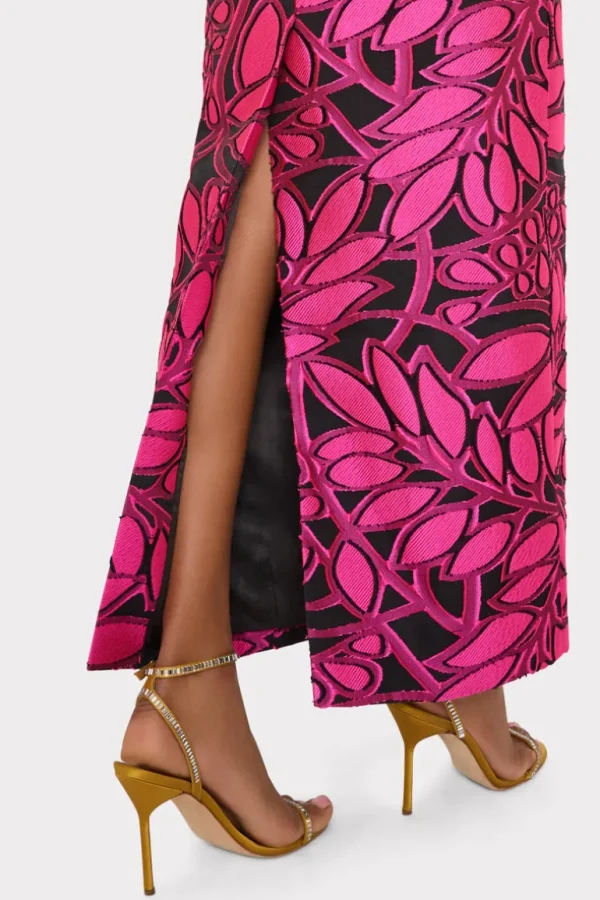 Cut from a textured jacquard fabrication, this elegant maxi length silhouette can be worn to cocktail parties or black tie affairs. It has a notch at the neckline and is finished with a back slit for movement and a back zipper to close.