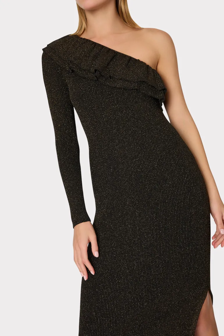 Crafted from metallic ribbed knit fabric with lots of stretch, this single shoulder silhouette is accented with a single ruffle along its neckline. It’s finish with a side slit for comfort and ease.