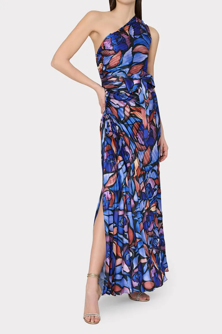 MILLY’S signature pleating and elegant design coalesce in this maxi dress that’s covered in our new Dream Rose Blue print. It has a one-shoulder silhouette with a self-tie bow at the waist for definition, and a side slit that provides comfort and dimension. Wear it with a pair of neutral heels to any of your upcoming events.
