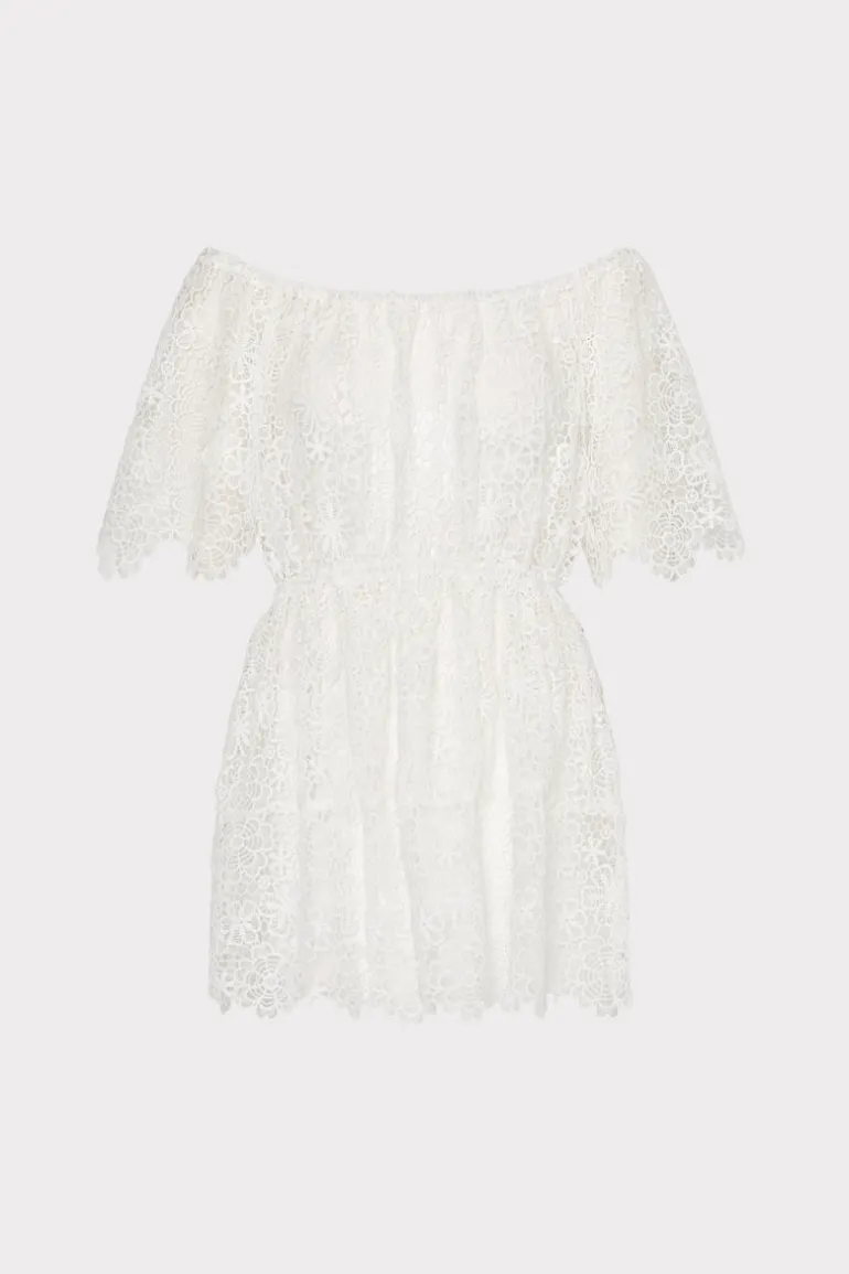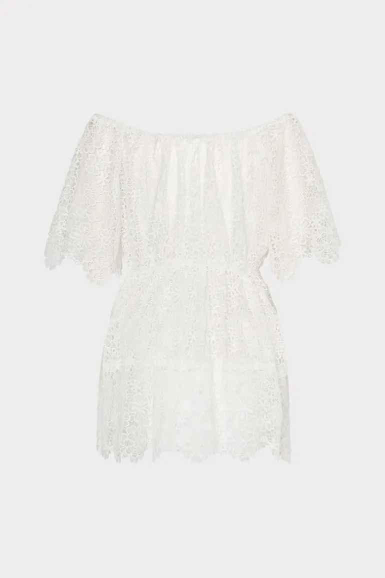 Crafted from a sheer lace fabric, this off-the-shoulder cover-up is neutral enough to wear over all of your favorite MILLY swimwear. It’s an easy-to-wear relaxed fit, has elastic at the waist, and is finished with subtle scalloping at the hemline.